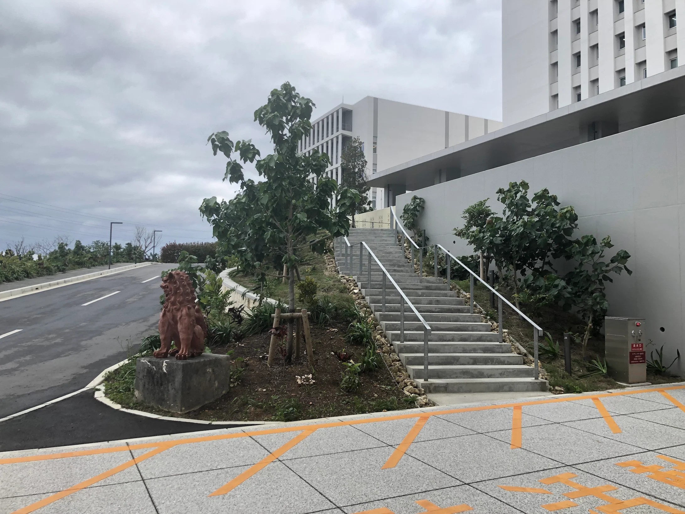 最高気温16℃、最低気温9℃と、おそらく今年2026年一番の低気温となった日の西普天間キャンパス、研究棟・管理研修棟入口。