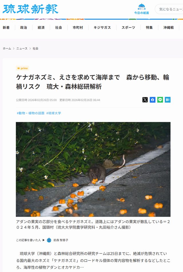 ◎ 文献: 丸田裕介・辻和希・佐藤行人・小林峻・小高信彦・鶴井香織. 2026. ケナガネズミによるアダン摂食とロードキル発生および餌としてのオカヤドカリの新知見. 哺乳類科学, 66: 45-56.